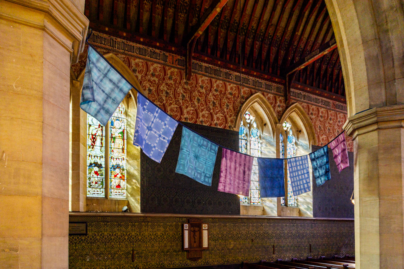Our third annual art exhibition showcased the work of eight artists - Ralph Anderson, Dominic Beattie, Cecilia Charlton, Will Cruickshank, Sophie Giller, Melania Toma, Imogen Wetherell and Anisa Zahedi - inspired by The Painted Church. Revival explored fine art and craft with experimentation and traditional craft techniques that echoed the work of the original artists who designed All Saints', through weaving, quilting, ceramics, printing and painting. Generously supported by The Arts Society Cambridge. All photographs by Noah Da Costa.