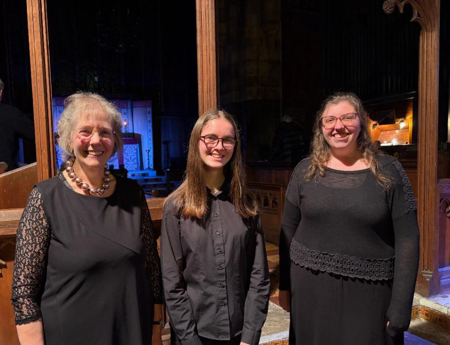 December 2025 This year's winner of the Granta Chorale carol competition, Maya Parker (centre) with judges Janet Wheeler and Sarah Cattley.